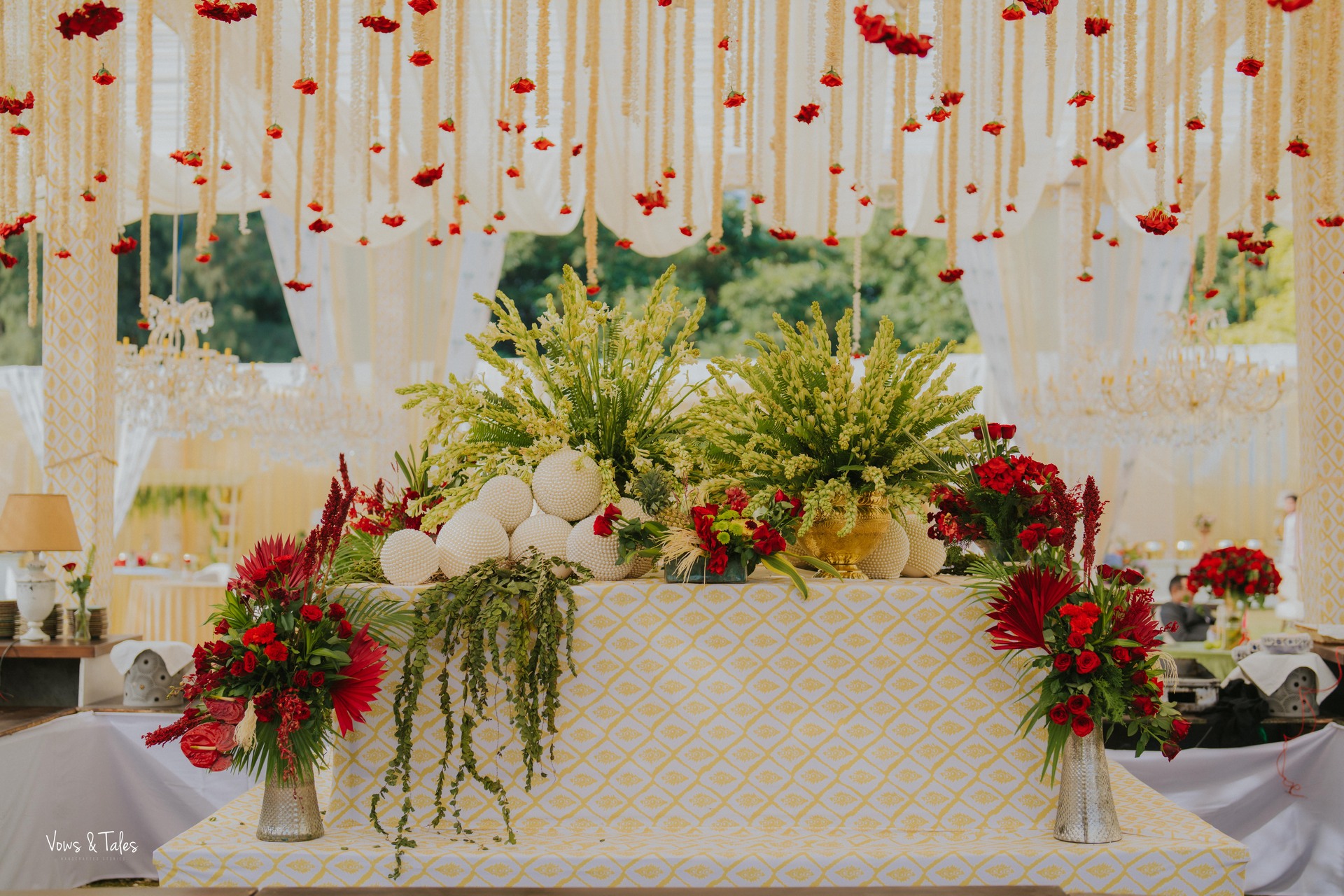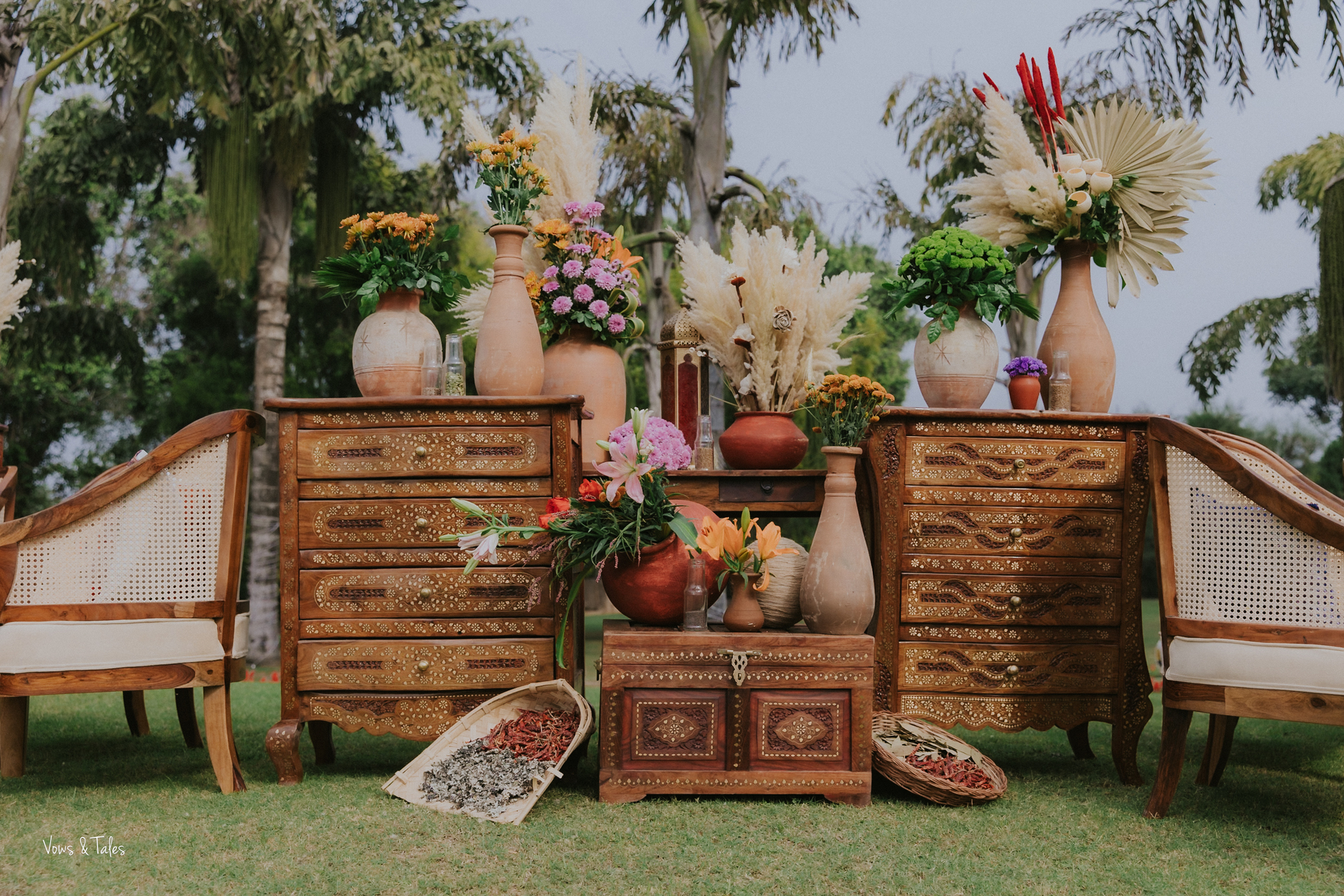 Inspired by Shiva and Parvati, the wedding ceremony was spiritual and majestic. Mouli threads wrapped trees, trishulslined the aisle, and bells echoed softly in the breeze. The highlight: a magnificent 3D Ganesha made of golden bells—a perfect start to forever.